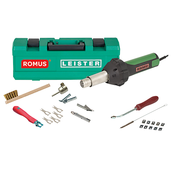 - Valise comprenant : 1 chalumeau Leister Triac ST, 1 buse porte buse encastrable, 1 gouge à rainurer, 1 couteau à araser mozart, 5 lames de rechange pour mozart, 1 buse rapide pincée, 1 brosse à buses, 10 lames de rechange, 1 buse rapide, 1 brosse à bougies, 1 buse à chanfreiner.